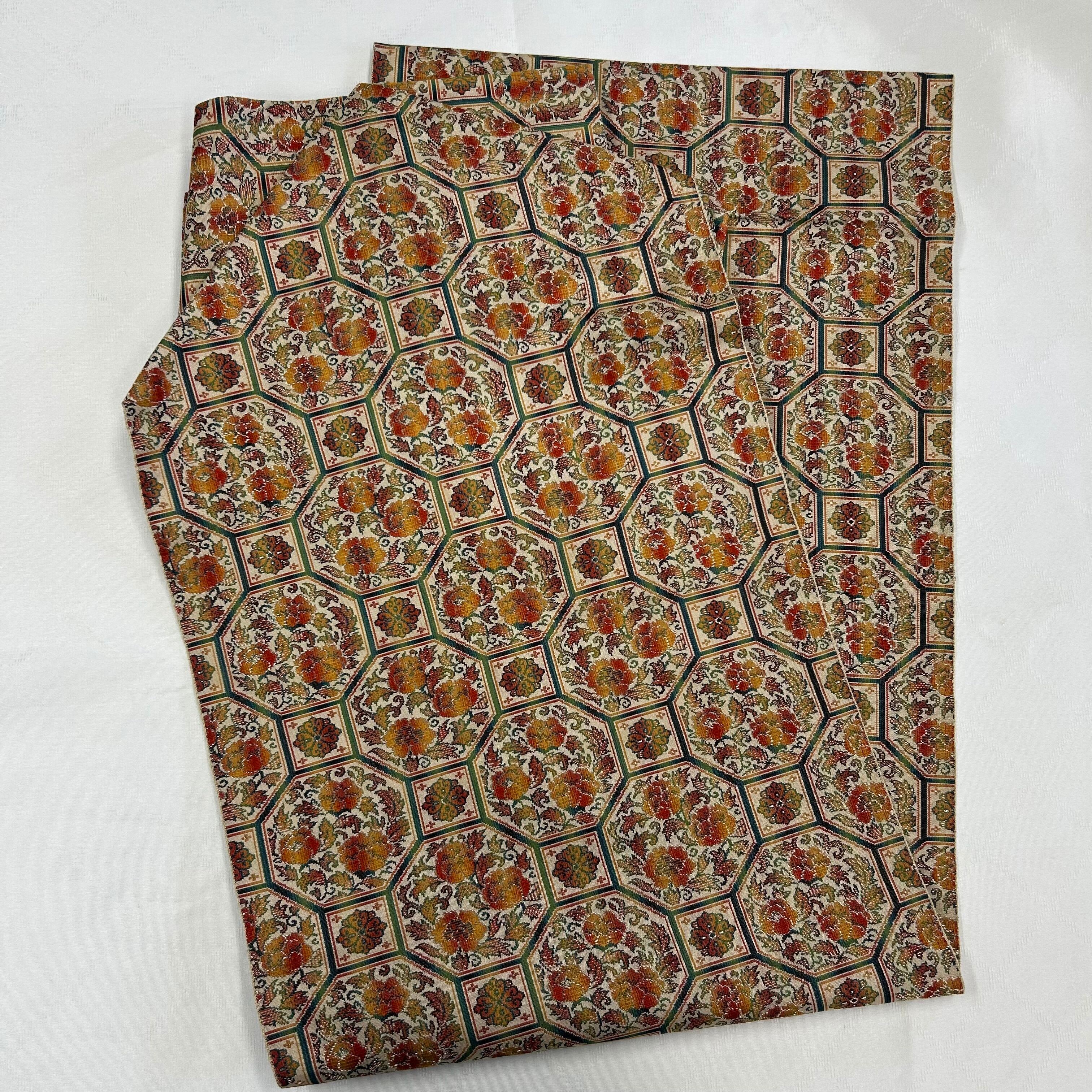 パターン模様が施されたこの帯は、スタイリングに印象的なアクセントを加える魅力的なアイテムです。シンプルな着物やカジュアルな洋装に合わせるだけで、全体の印象を華やかに変化させます。特別なお出かけから日常のおしゃれまで、幅広いシーンで活躍します。